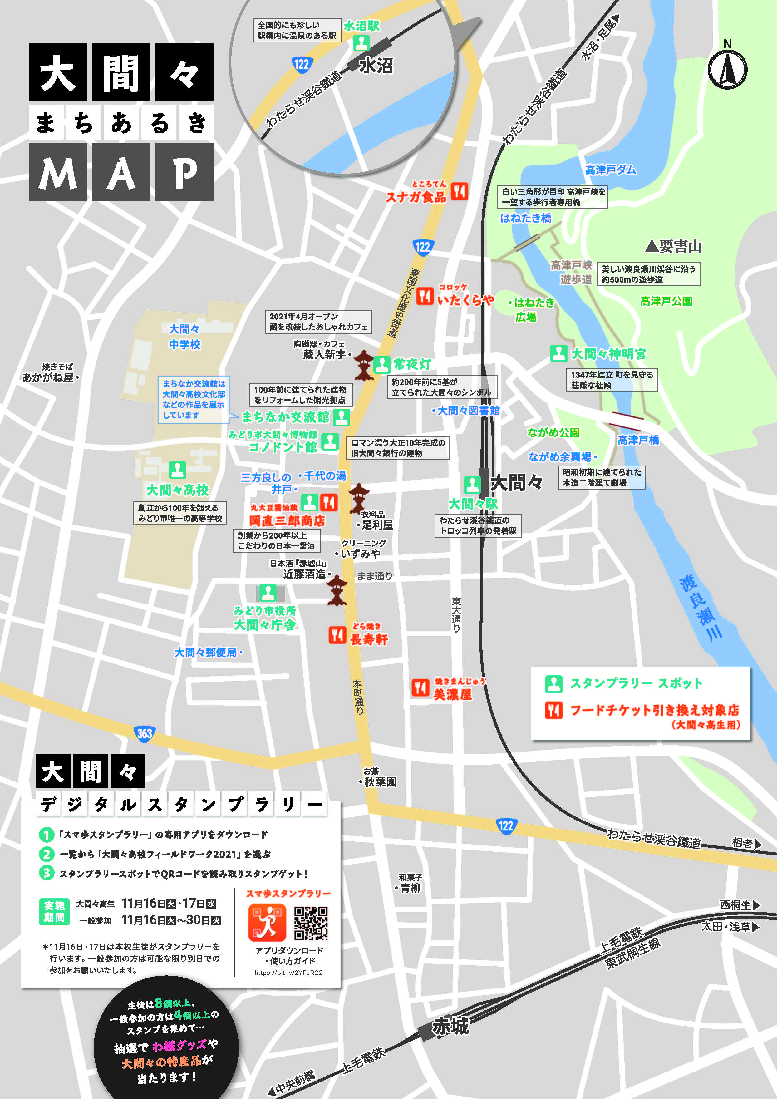 ■対象スポット(全9か所)※地図上のスタンプマークのところです。 ・コノドント館/群馬県みどり市大間々町大間々1029 ・まちなか交流館/群馬県みどり市大間々町大間々1040 ・大間々駅/群馬県みどり市大間々町大間々1375 ・水沼駅/群馬県桐生市黒保根町水沼151 ・岡直三郎商店/群馬県みどり市大間々町大間々1012 ・大間々庁舎/群馬県みどり市大間々町大間々1511 ・神明宮/群馬県みどり市大間々町大間々2245 ・蔵人新宇さん横の常夜灯/ 群馬県みどり市大間々町大間々1050付近 ・大間々高校/群馬県みどり市大間々町桐原193-1 |